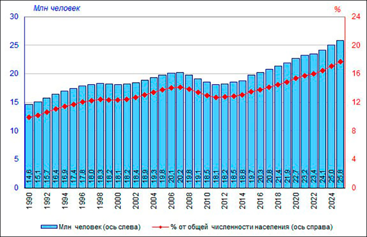 Численность населения России 65 лет и старше, миллионов человек и % от общей численности населения на начало 1990-2025 годов