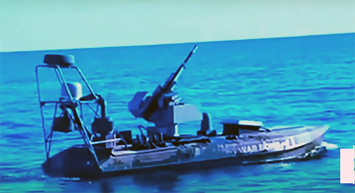Морской дрон Sea Baby, оснащённый гиростабилизированной турелью с 14,5-мм пулемётом КПВТ, несущий итальянские морские мины MN103 Manta. Скриншот ТГ-канала "Военный Осведомитель"