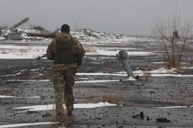 Фото: Ополченец на фоне усеянного хвостовиками снарядов РСЗО асфальтового поля © Shatokhina Natalya / Global Look Press
