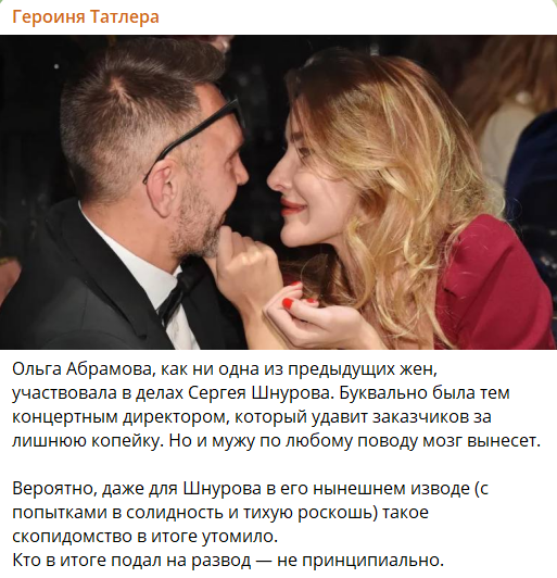 Ольга Абрамова, как ни одна из предыдущих жен, участвовала в делах Сергея Шнурова, пишет светский телеграм-канал Героиня Татлера. Авторы сообщают, что Ольга пыталась взять под контроль как концертные, так и другие дела своего мужа.