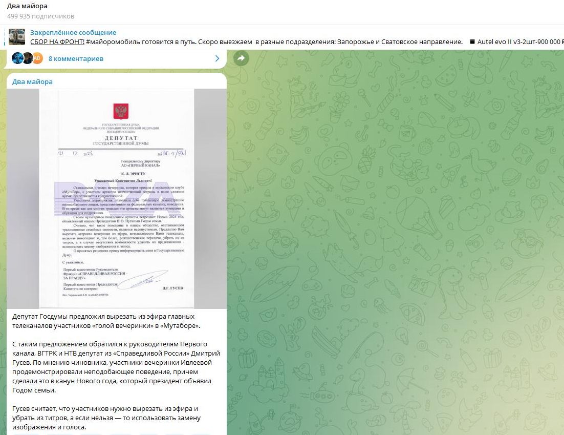 Обращение депутата Гусева к руководству федерального телеканала с призывом убрать из новогоднего эфира участников "вечеринки Ивлеевой". Скриншот: телеграм-канал "Два майора"