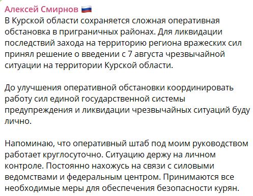 В Курской области объявлен режим чрезвычайной ситуации на фоне сложной оперативной обстановка в приграничных районах, заявил Алексей Смирнов в своем телеграм-канале.