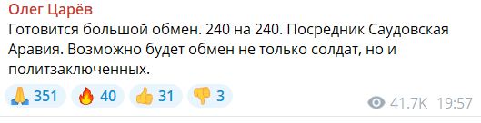 По данным политика, посредником в обмене военнопленными может выступить Саудовская Аравия. Царев утверждает, что к обмену могут готовить не только солдат, но и политзаключенных.