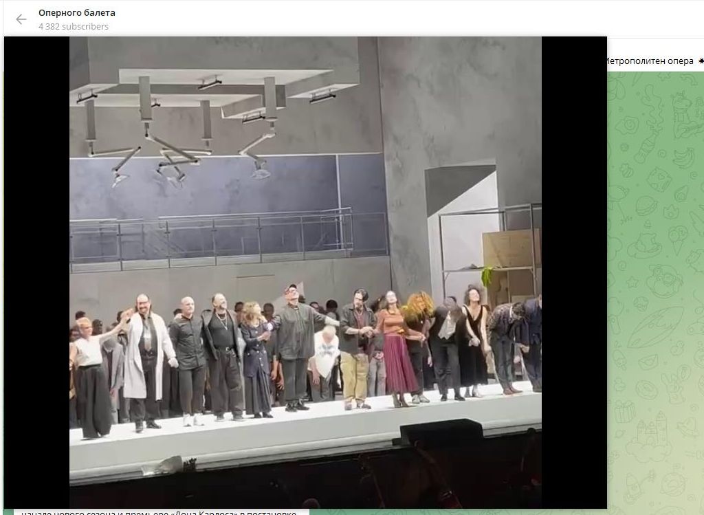Кирилл Серебренников (на сцене в центре) слушает, как его освистывает венская публика. Скриншот: телеграм-канал "Оперного балета"