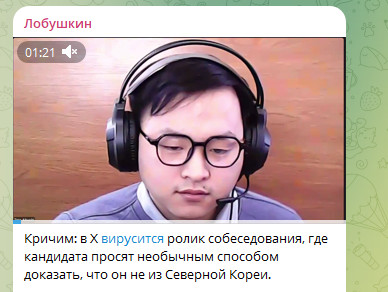 В соцсети X завирусился ролик, где проводится онлайн-собеседование. Кандидата азиатской внешности попросили доказать, что он не из КНДР. Сделать это нужно было весьма нестандартным способом – произнести оскорбление в адрес председателя Государственного совета страны Ким Чен Ына. Парень подумал-подумал и сбросил звонок.