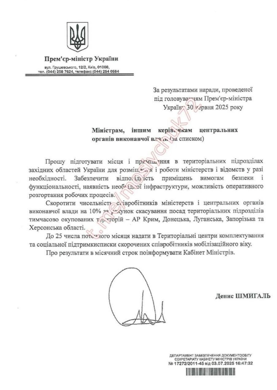 Мосийчук: украинский Кабмин разослал указания готовиться к переезду министерств из Киева на запад страны