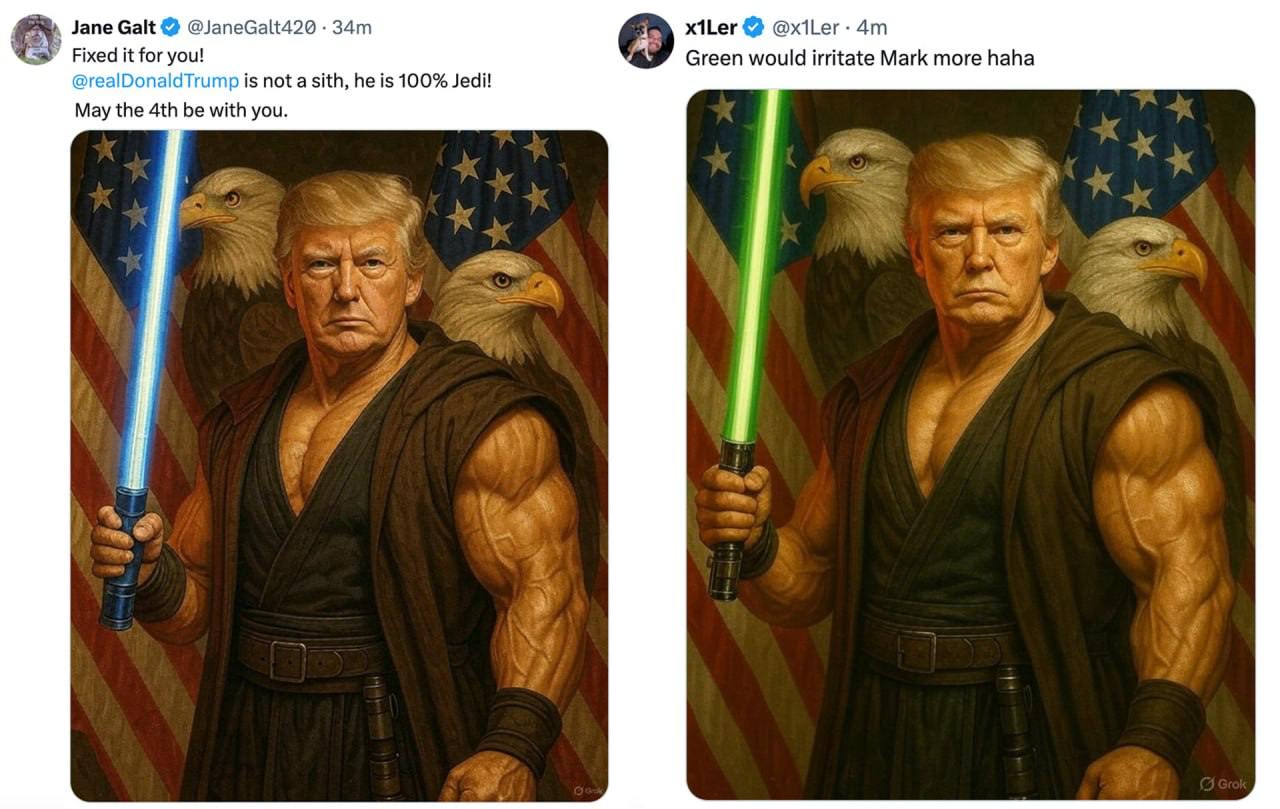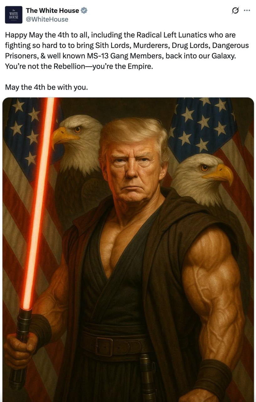 На сгенерированной ИИ картинке Дональд Трамп предстал с накаченным торсом в одежде джедаев и с лазерным мечом в руке. В подписи к изображению Белый дом сообщает о том, что "вы не Восстание, а Империя" и желает всем счастливого "Дня "Звездных войн", который в США неофициально празднуют 4 мая.