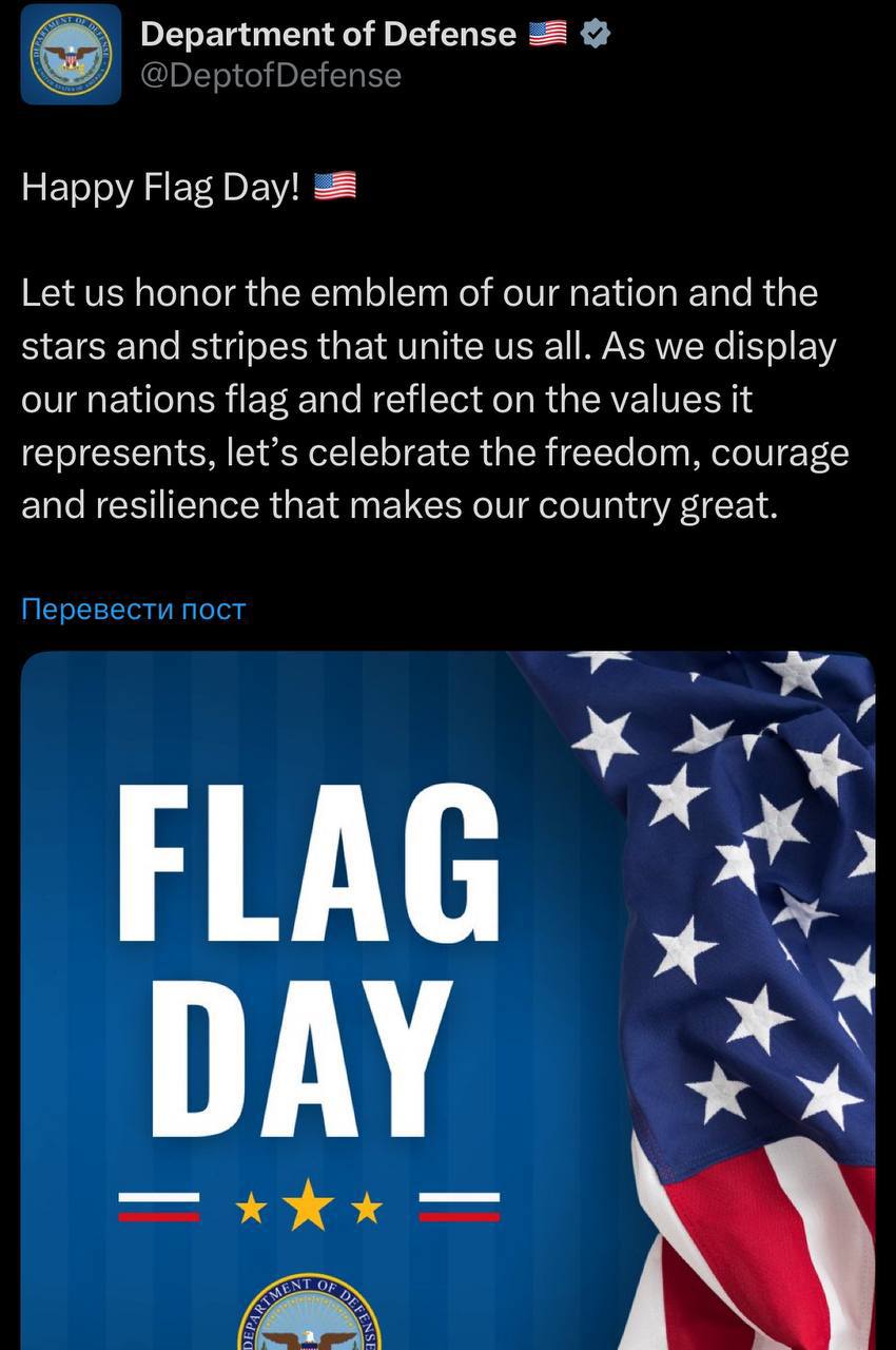 В День американского флага Пентагон опубликовал официальное поздравительное сообщение в соцсети X, сопроводив его графическим изображением. Однако пользователи сети обратили внимание на необычный элемент дизайна — по центру картинки отчётливо видны два государственных флага России.