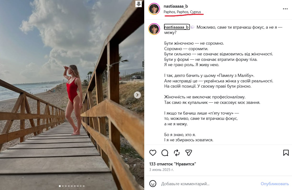 Судя по запрещённым соцсетям нашей героини, она имеет огромный боевой опыт ведения обороны на курортах Буковеля, острова Кипр, а также в теле- и киностудиях, фотосалонах, соляриях и дорогих отелях Киева,