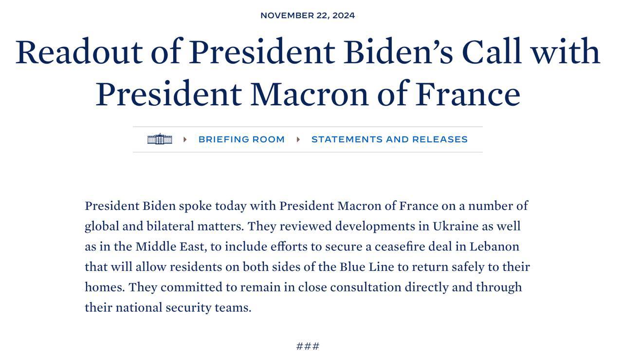 Президент Байден обсудил сегодня с президентом Франции Макроном ряд глобальных и двусторонних вопросов: события на Украине, а также на Ближнем Востоке, в том числе, усилия по достижению соглашения о прекращении огня в Ливане.