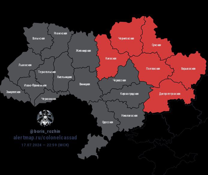Судя по мониторинговым данным, тревога объявлена на территории Днепропетровской, Киевской, Полтавской, Сумской, Харьковской и Черниговской областей.
