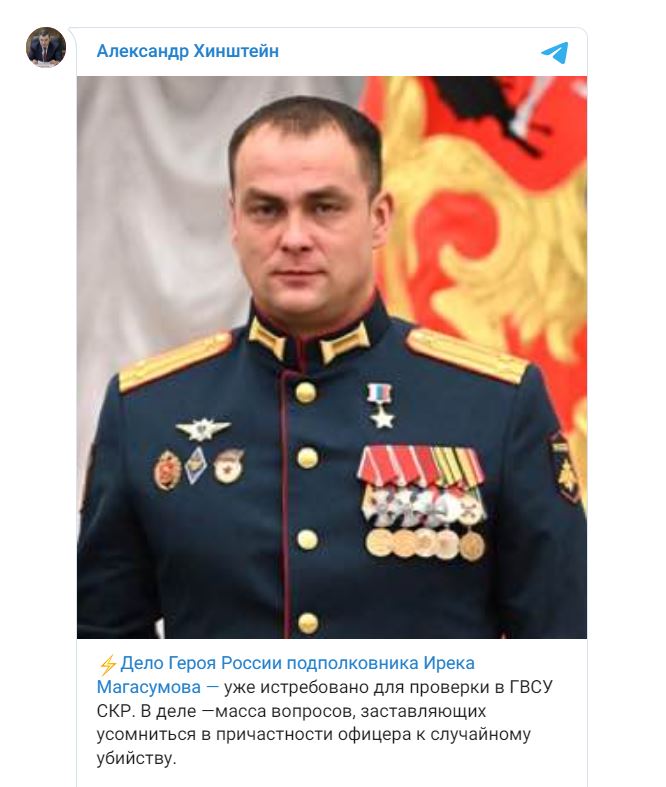 Военный суд ЛНР вынес приговор замкомандиру 74-й отдельной мотострелковой бригады Минобороны Герою России Иреку Магасумову. Военного признали виновным в убийстве (ч. 1 ст. 105 УК РФ) и хулиганстве (ст. 213 УК РФ) и приговорили к 11 годам колонии строгого режима, сообщает издание "Коммерсант" со ссылкой на адвоката Магасумова Константина Елфимова.