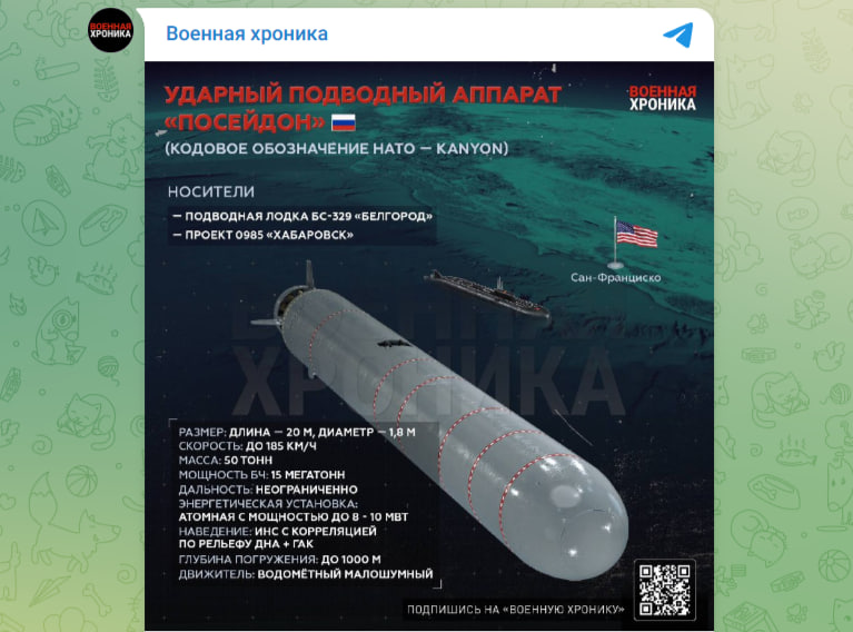 И пусть "Посейдон" — это не ядерное оружие в привычном его понимании, но он всё равно может рассматриваться как оружие Судного дня, говорил заместитель председателя Совета Безопасности Дмитрий Медведев.