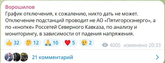 В своем телеграм-канале глава администрации Дмитрий Ворошилов сообщил, что в самом Пятигорске и еще четырех поселках Ставропольского края ввели график временного отключения электроэнергии.
