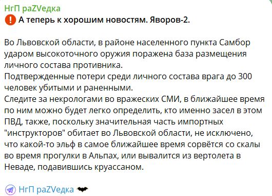 По данным телеграм-канала "НгП раZVедка", подтвержденные потери среди личного состава ВСУ оцениваются в 300 человек убитыми и ранеными. Военкоры напомнили, что во Львовской области дислоцируется значительная часть прибывшего на Украину западного контингента военных инструкторов.