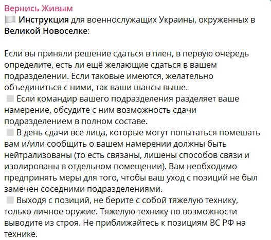 Канал "Рамзай" опубликовал подробную инструкцию для сдачи в плен окруженных в Великой Новоселке военнослужащих Украины.