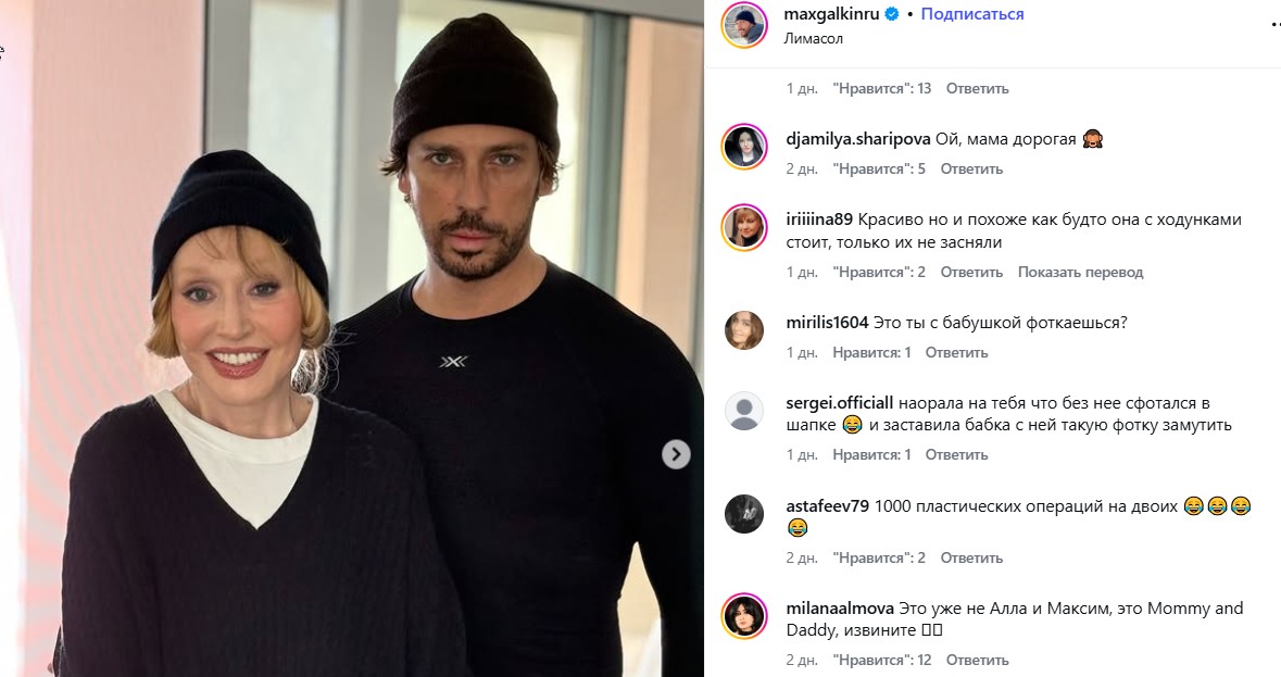 Алла Пугачёва воссоединилась с Максимом Галкиным* на Кипре после его возвращения из Куршевеля с детьми. Супруги сфотографировались в парных образах: чёрные пуловеры и одинаковые шапочки.
