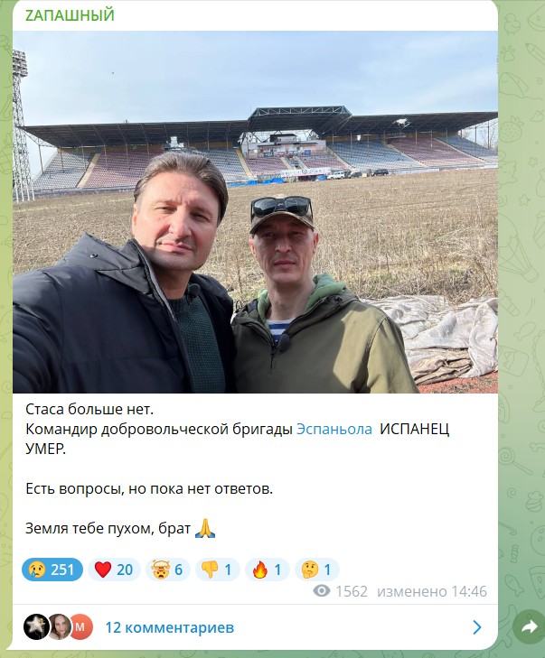 "Стаса больше нет. Командир добровольческой бригады Эспаньола Испанец умер. Есть вопросы, но пока нет ответов",